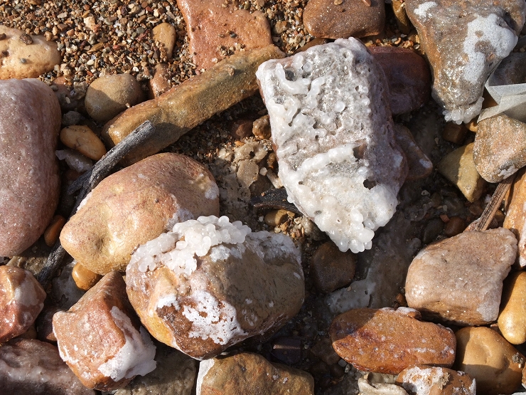 死海の砂利は塩で覆われており、湖の下は白い塩板で固くなっています。