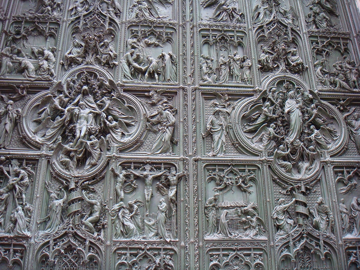 このドゥオーモの迫力は目をみはるものがあり、内部にはステンドグラスから差し込む光を受けて神秘的で荘厳な雰囲気が漂っていました。これは正面の扉。
