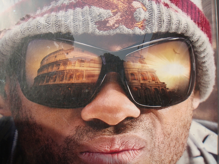 街を歩いていると、ハンコックのウィルスミスのサングラスにコロッセオが映っているのを発見。