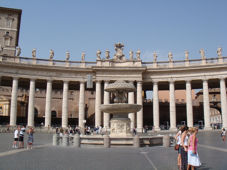 サンピエトロ広場は、両側に半円形の回廊があり、ドーリア式の円柱284本が並ぶ壮麗な広場。