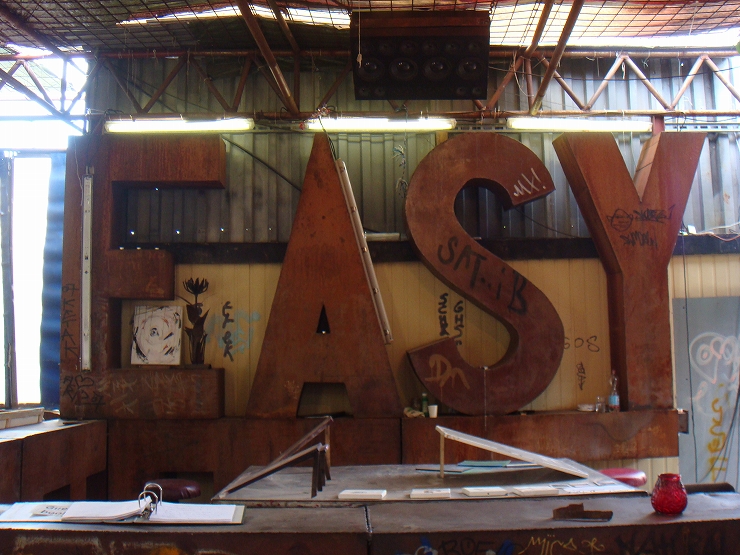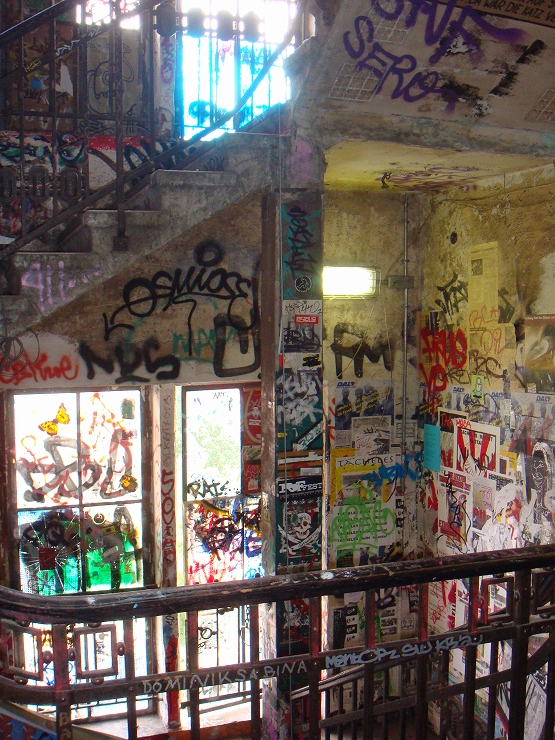 ここはタヒェレス (Tacheles) http://super.tacheles.de/cms/ といい、第2次世界大戦の戦渦を受けた建物がそのまま廃墟として残存してたところを、アーティストたちが続々とアトリエとして使用し、その芸術の制作の場としています。