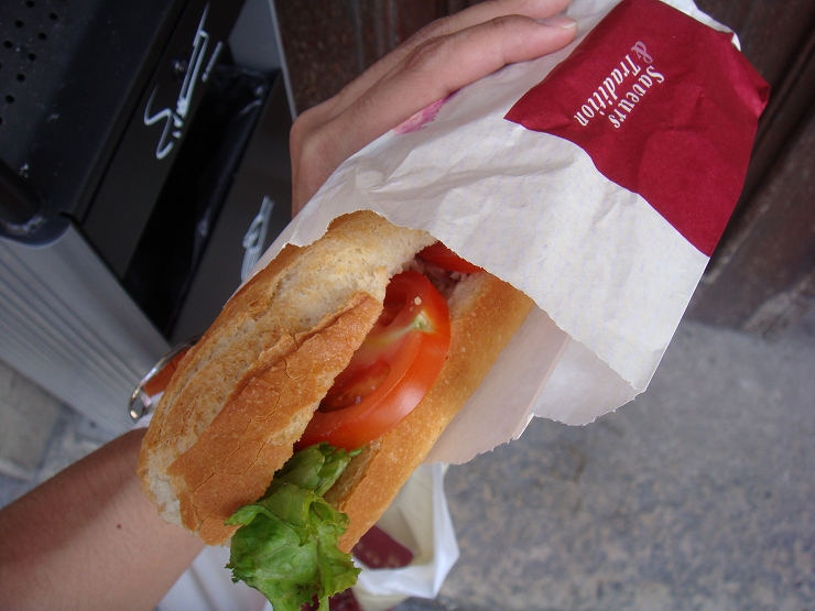 フランスパンに野菜やチキンをサンドしたもので、