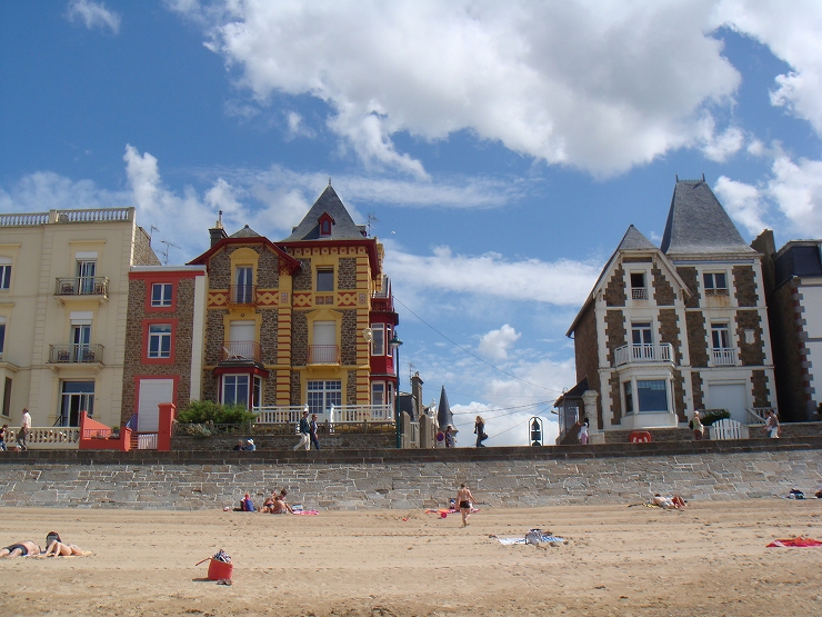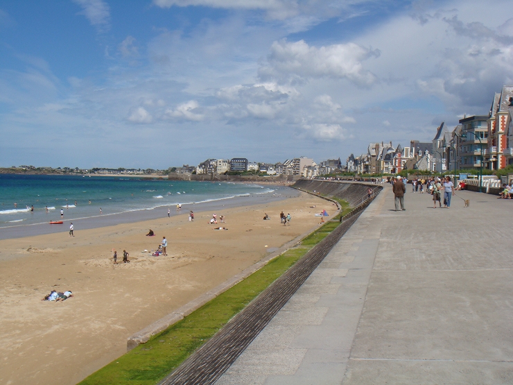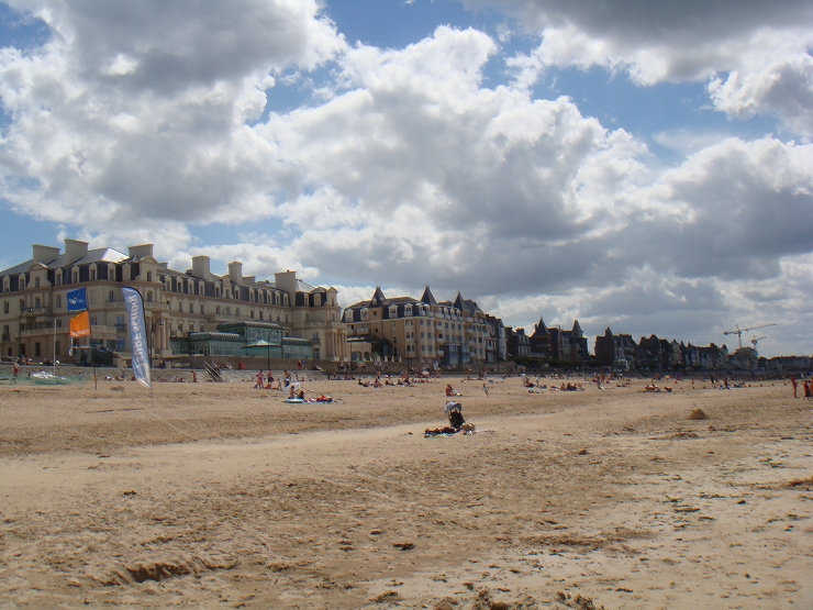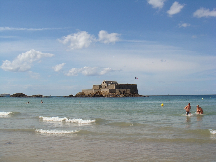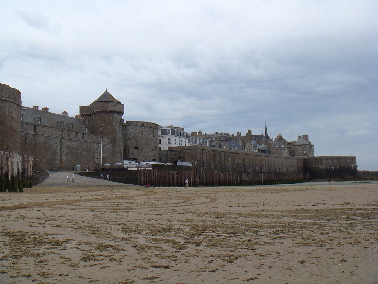 永遠と続く広大なビーチで、砂浜の向こうにはかつて海賊の街として栄えたサンマロの城壁が見え、海を見渡すとグランベ島という城のある離島が見えます。